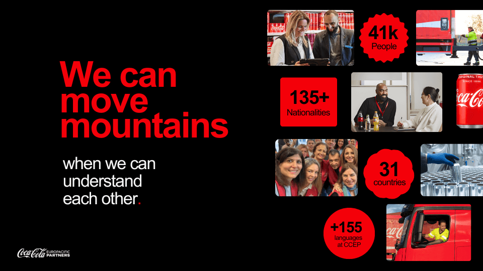 Through a partnership with Bureau Works, CCEP has launched a company-wide Language Portal, a digital gateway that allows anyone in the organization to translate, understand, and communicate across languages instantly.