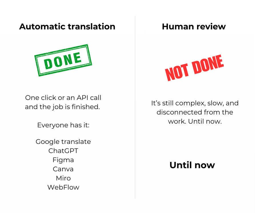 Almost everyone today has a tool to translate content automatically. That part is easy. Figma, Miro, Canva, Webflow, they all have built-in tools to translate with one click.
