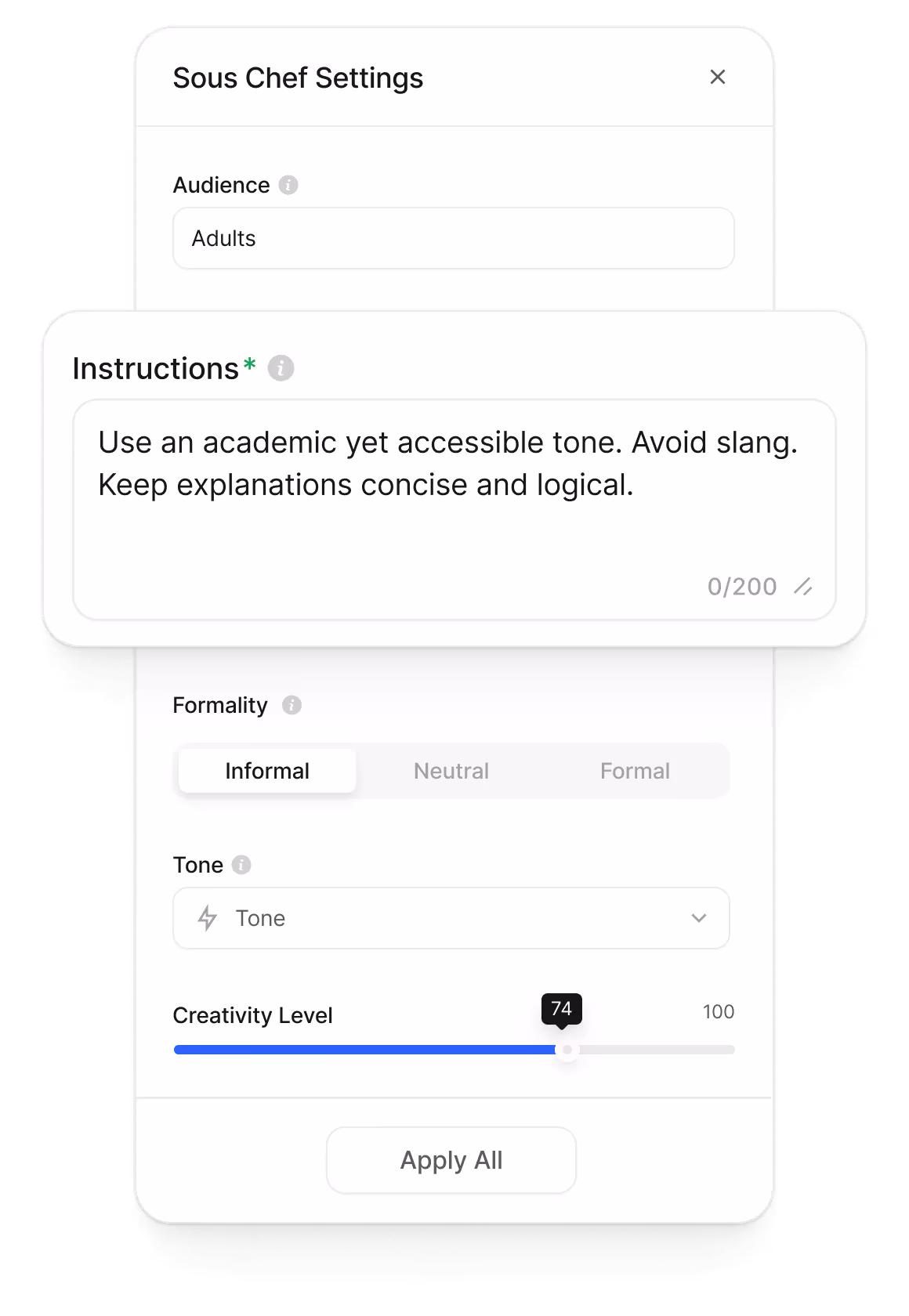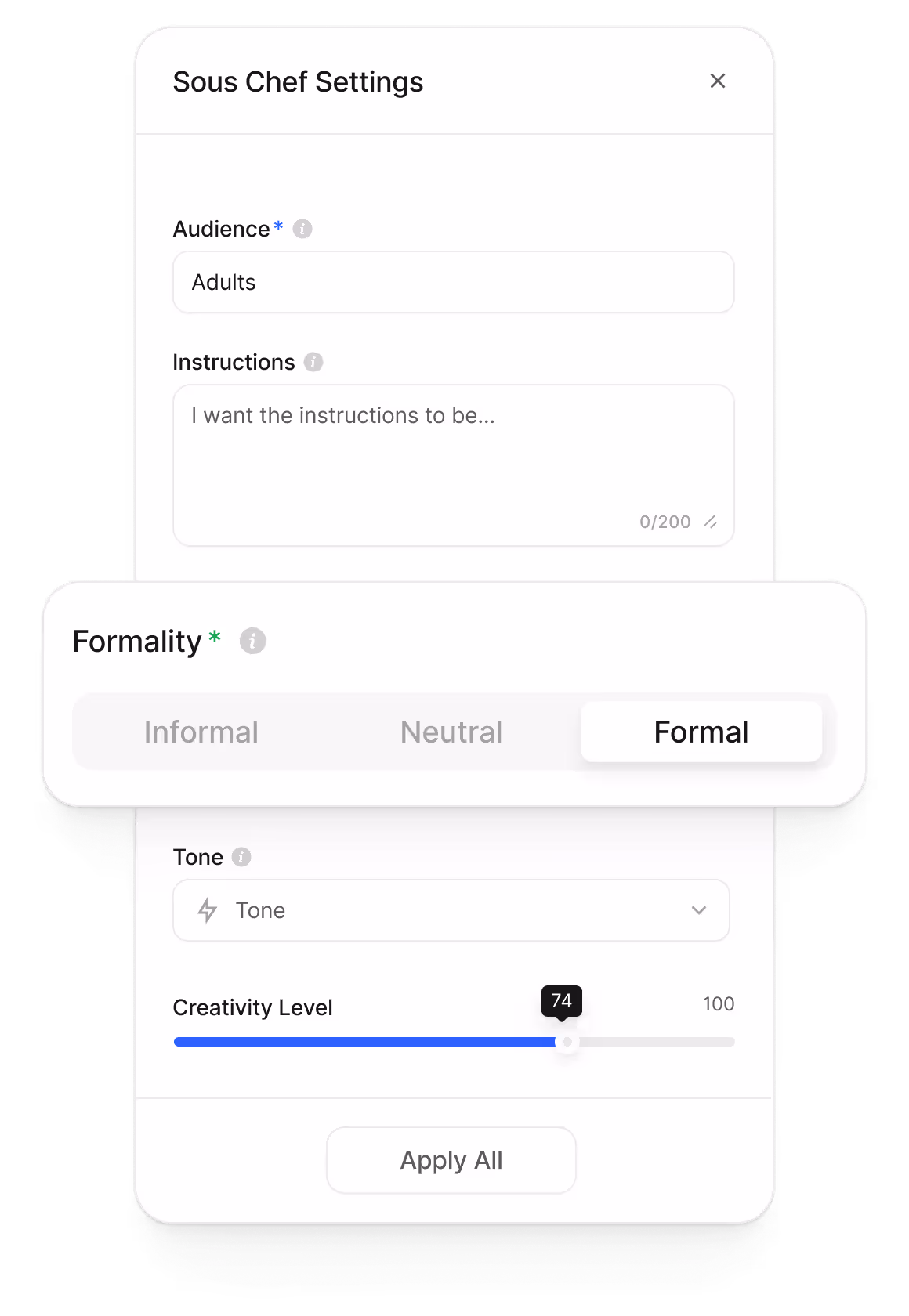 Sous-Chef lets you customize every aspect of your translation before you hit “Generate.” Define your audience, set the tone, adjust formality, and control creativity to deliver content that feels perfectly written for its purpose.