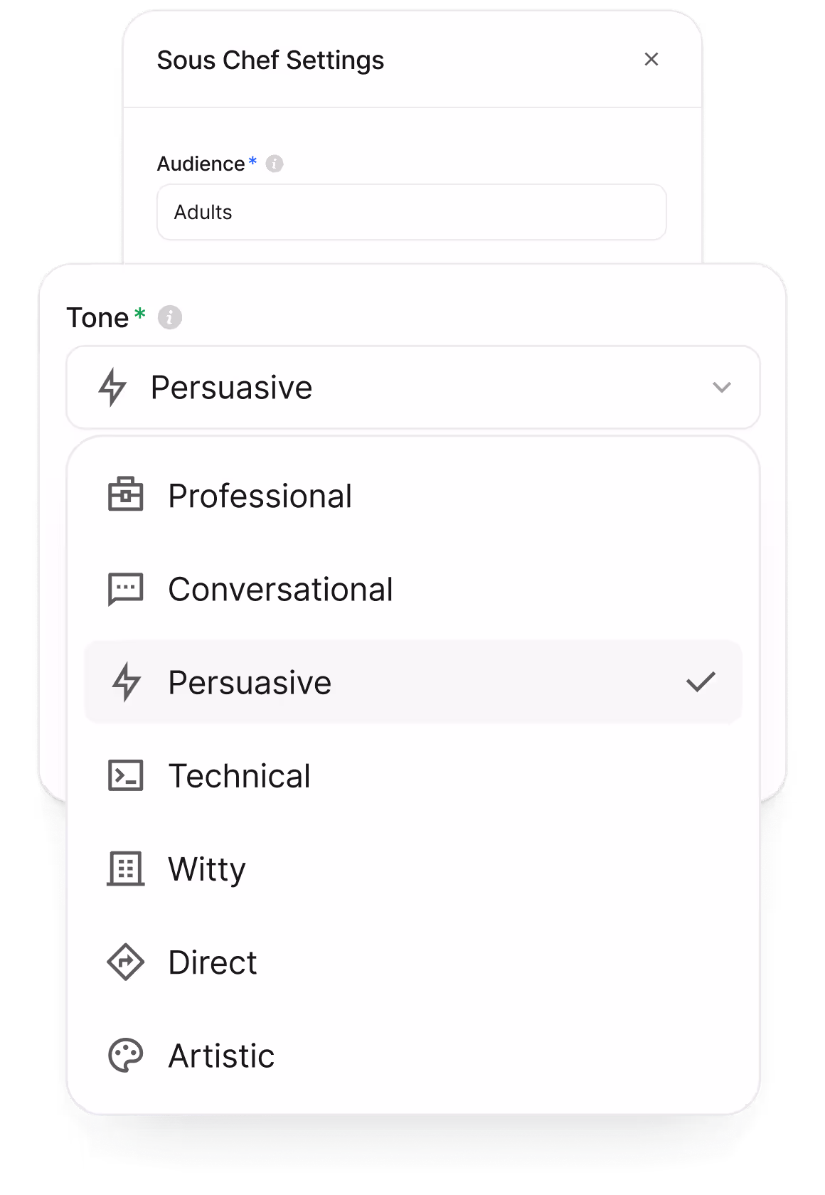 Decide how your content speaks, Professional, Conversational, Persuasive, Technical, or Witty. Sous-Chef fine-tunes the personality behind the words so your message lands exactly right.