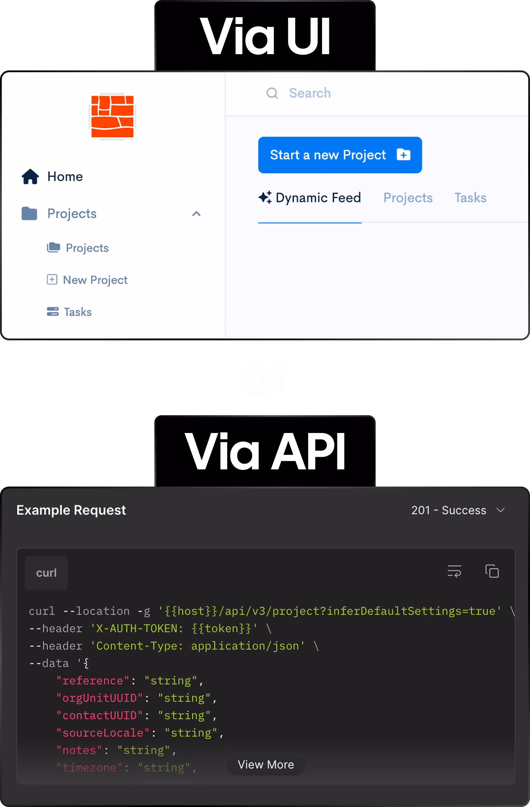 Everything available in the UI has a corresponding API call. Webhooks allow bidirectional integrations